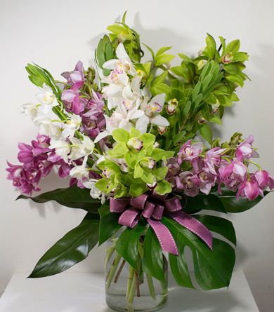 3, 5 vagy 7 teljes ág cimbídium orchideát kötünk össze különleges, elegáns zöldekkel. Áganként 12-14 ragyogó orchidea virág.